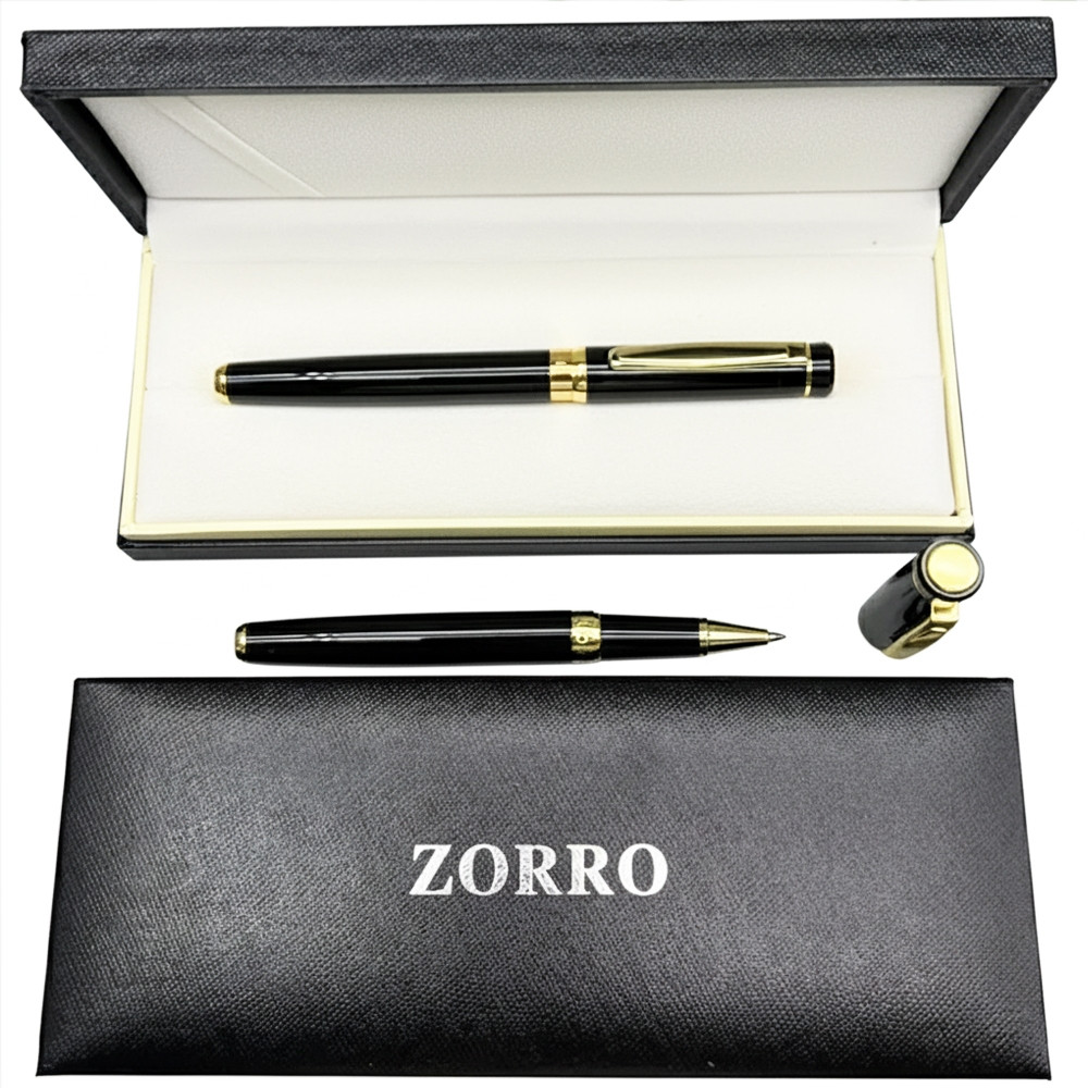 Елегантна ролерна ручка ZORRO — це гармонійне поєднання класичного стилю та практичності. Корпус виконаний у чорному глянцевому кольорі із золотистими металевими акцентами, які підкреслюють вишуканий дизайн. Упакована у фірмову подарункову коробку, така ручка стане чудовим діловим аксесуаром і солідним подарунком.